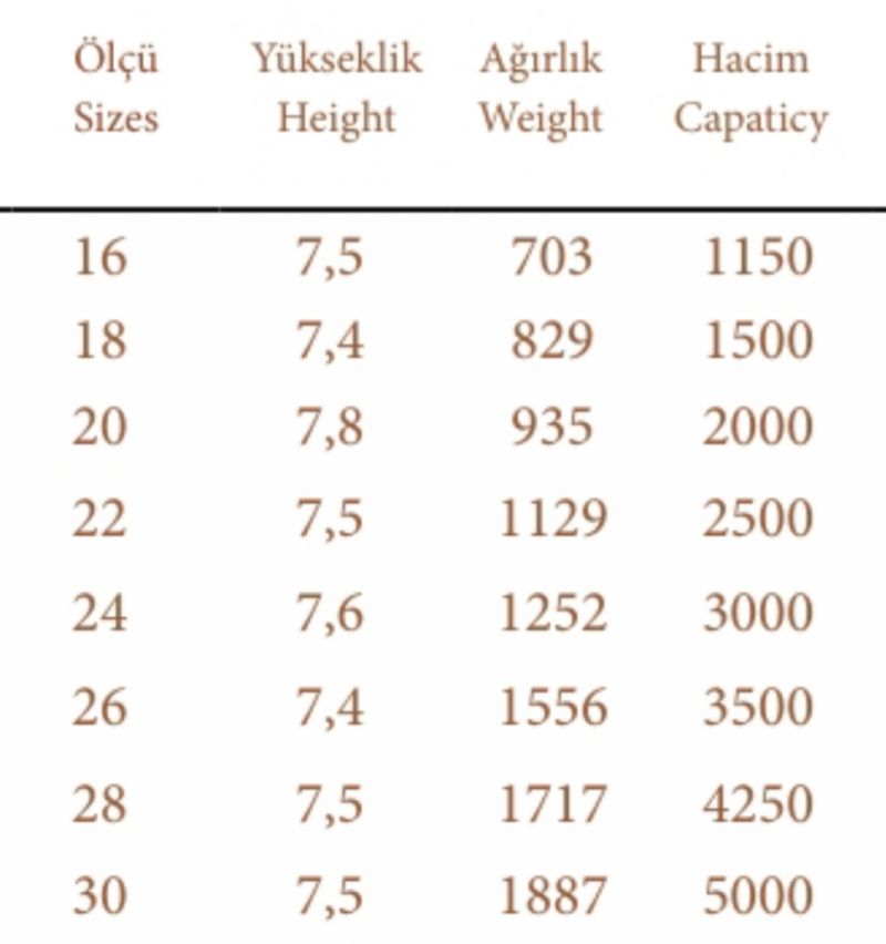 Farklı boy ve hacimlerde.Ayrıntılar için inceleyiniz.