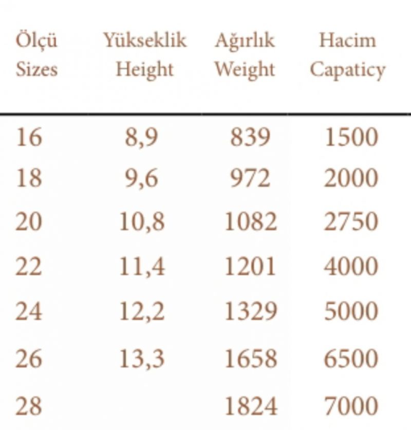 Farklı boyut ve hacim bilgileri için inceleyiniz